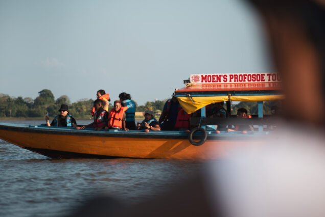 Guests board the boat and begin the journey along the Suriname River toward the Commewijne district.